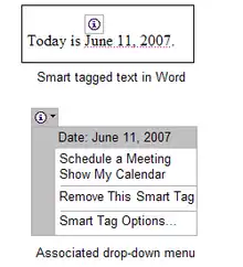 With smart tags enabled, Microsoft Word attempts to recognize certain types of data in a document (for example, dates or names) and automatically makes such text a smart tag, visually indicated by a purple dotted underline. Clicking on a smart tag is the selection-based search command to bring up a list of possible actions for that data type.