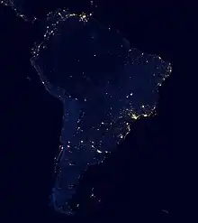 Brazil is the largest country in South America, covering a little less than half of the continent's land area and encompassing around half of the continent's population.[23] The remaining countries and territories are divided among four subregions: the Andean states, Caribbean South America, The Guianas, and the Southern Cone.[24]