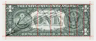 Scan of US dollar bill reverse with root 7 rectangle annotation