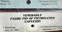 - ↑ "Pastoral Visit of His Holiness Pope Francis to Pietrelcina And To San Giovanni Rotondo, on the 50th Anniversary of the Saint's death". vatican.va. Vatican. 17 March 2018. Retrieved 25 February 2023.