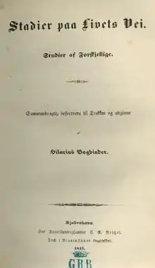Stages on Life's Way (Danish: Stadier på Livets Vej; historical orthography: Stadier paa Livets Vej) is a philosophical work by Søren Kierkegaard written in 1845. The book was written as a continuation of Kierkegaard's prior work Either/Or. While Either/Or is about the aesthetic and ethical realms, Stages continues onward to the consideration of the religious realms. Kierkegaard's "concern was to present the various stages of existence in one work if possible."[1] His father Michael Pedersen read Christian Wolff, and Søren himself was influenced by both Wolff and Kant to the point of using the structure and philosophical content of the three special metaphysics as the scheme or blueprint for building the ideas for this book.[2]