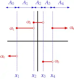 Sometimes, the intervals are required to be right-open[1] or allowed to be singleton.[2] The condition that the collection of intervals must be finite is often dropped, especially in school mathematics,[3][4][5] though it must still be locally finite, resulting in the definition of piecewise constant functions.