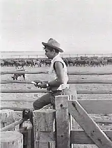 The traditional attire of a stockman or grazier is a felt Akubra hat; a double-flapped, two-pocket (for stock notebooks) cotton shirt; a plaited Kangaroo leather belt carrying a stockman's pocket knife in a pouch; light coloured, stockman cut, moleskin trousers with brown elastic side boots. The moleskin trousers have now largely been replaced by jeans. The plaited belt is often replaced by a working stockman or ringer with a belt known as a Queensland Utility Strap which can be used as a belt, neck strap, lunch-time hobble or a tie for a "micky".[5] This attire is still used in Australian Stock Horse competitions. Pocket knives may be used to castrate and/or earmark an animal, to bang cattle tails or in an emergency to cut free an animal entangled in a rope or horse tack.[6] Specially designed and cut for riding, oilskin Driza-Bone coats are used during wet weather. The horse typically wears a ringhead bridle, a saddle cloth, a leather Australian stock saddle, which may be equipped with a breastplate in steep country, and saddlebag and quart-pot.[3]
