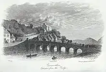 Geoffrey of Monmouth, writing in 1188, began the legend that Merlin was born in a cave outside Carmarthen.[21] The town's Welsh name, Caerfyrddin, is widely claimed to mean "Merlin's fort", but a reverse etymology is also suggested: the name Merlin may have originated from the town's name in the anglicised form of Myrddin.[22] (See Merlin § Name). An alternative explanation is that Myrddin is a corruption of the town's Roman name, Moridunum, meaning "sea fort."[23]