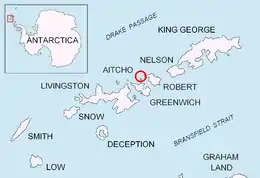 ![]() Location of Aitcho Islands in the South Shetland Islands | |