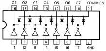 The ULN2003A is also similar to the ULN2001A (4 inputs) and the ULN2801A, ULN2802A, ULN2803A, ULN2804A and ULN2805A, only differing in logic input levels (TTL, CMOS, PMOS) and number of in/outputs (4/7/8).[3]