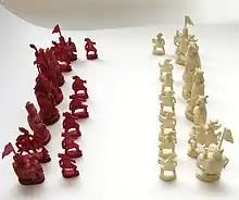 In the next ten verses the alternative coloring of the squares on the board is mentioned for the first time, not yet in general use but used by some players (Sunt quibus has placuit duplici fucare colore) as a simple yet advantageous invention to better calculate the moves, besides giving players the ability to discover, more easily, mistakes or false moves. Between verses 21-44 the two sides, red and white (Pars hæc si candet, illa rubore nitet), are described, together with the pieces. The movement of the pieces as well as the main regulatory conditions of the game are near identical to shatranj (Perso-Arabic chess), except for the pawn-promotion rule.[5] From the poetic descriptions of the pieces and their movements, it can be interpreted that the movements differ from modern chess and can be summarized as follows: