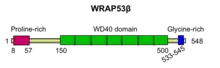 The WRAP53β protein is highly evolutionary conserved, with homologs (confined to its WD40 repeats) in vertebrates, invertebrates, plants and yeast.[5][12][13] WRAP53β consists of a proline-rich N-terminus, a central WD40 domain and a glycine-rich C-terminus (Figure 3). The WD40 domain of WRAP53β serves as a scaffold for multiple interactions between a wide variety of molecules.
