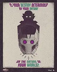Boseman felt the episode allowed T'Challa to have "more of a wink and a smile" without the pressure of being king, but still retained his "moral compass".[14] Bradley described T'Challa as a character who changes his environment rather than having a character arc himself, saying, "He doesn't go through a transformation, he transforms the world".[9][13] The writers therefore wanted to see how T'Challa could "transform outer space",[9] and decided that he would become a Robin Hood-like figure who is "creating the best world for people, creating the best life" while still being true to who he is.[12] The episode explores the "ripple effect" that this has across the galaxy,[16] resulting in changes from the MCU films such as the Guardians of the Galaxy never forming; the Ravagers becoming a "more noble, straight-laced operation";[12] and the supervillain Thanos being reformed and joining the Ravagers. The writers initially avoided addressing Thanos in the episode, but added him when they realized that he could be a good example to show the differences in this universe caused by T'Challa. A running joke throughout the episode is that Thanos still believes his plan to eliminate half the universe would have worked.[12] This change to Thanos created the "power vacuum" that allows Taneleer Tivan / The Collector to become a supervillain, and also allows Thanos' adopted daughter Nebula to be portrayed as better-adjusted. The writers chose to hint at a relationship between Nebula and T'Challa because they did not feel Gamora would be a good romantic fit for T'Challa as she was for Quill in the Guardians of the Galaxy films.[11] This gives Nebula a femme fatale/Tess Ocean-type role in the episode,[11][12][17] with this version of the character marketed as "Heist Nebula".[18]